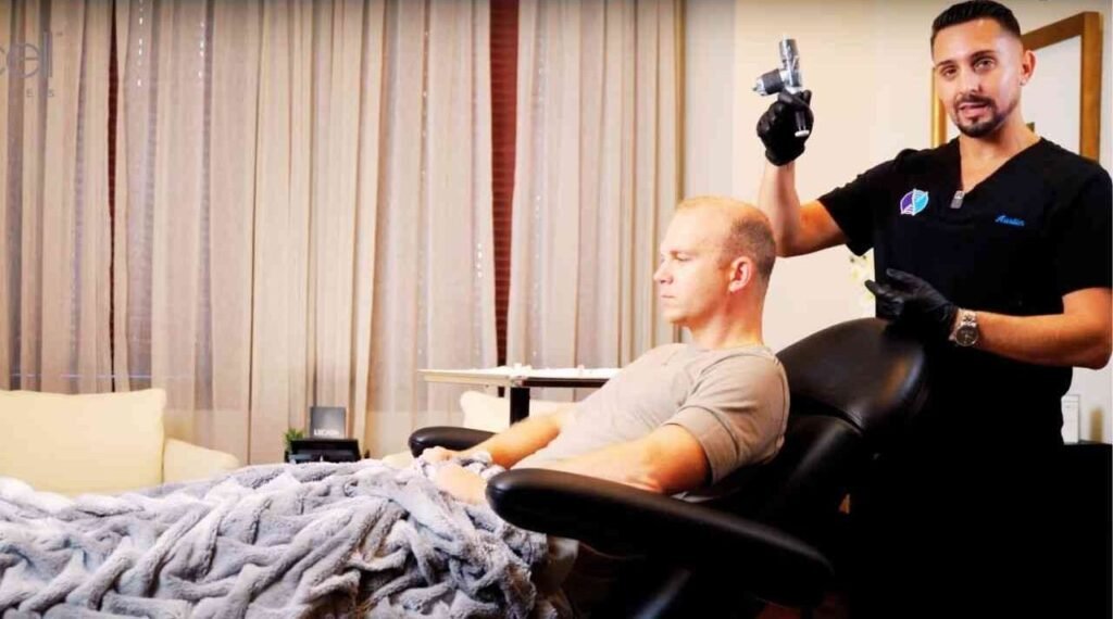 It stimulates hair follicles by creating micro-injuries in the scalp, triggering a healing response that encourages new hair growth. The use of stem cell-derived growth factors further enhances follicle regeneration.